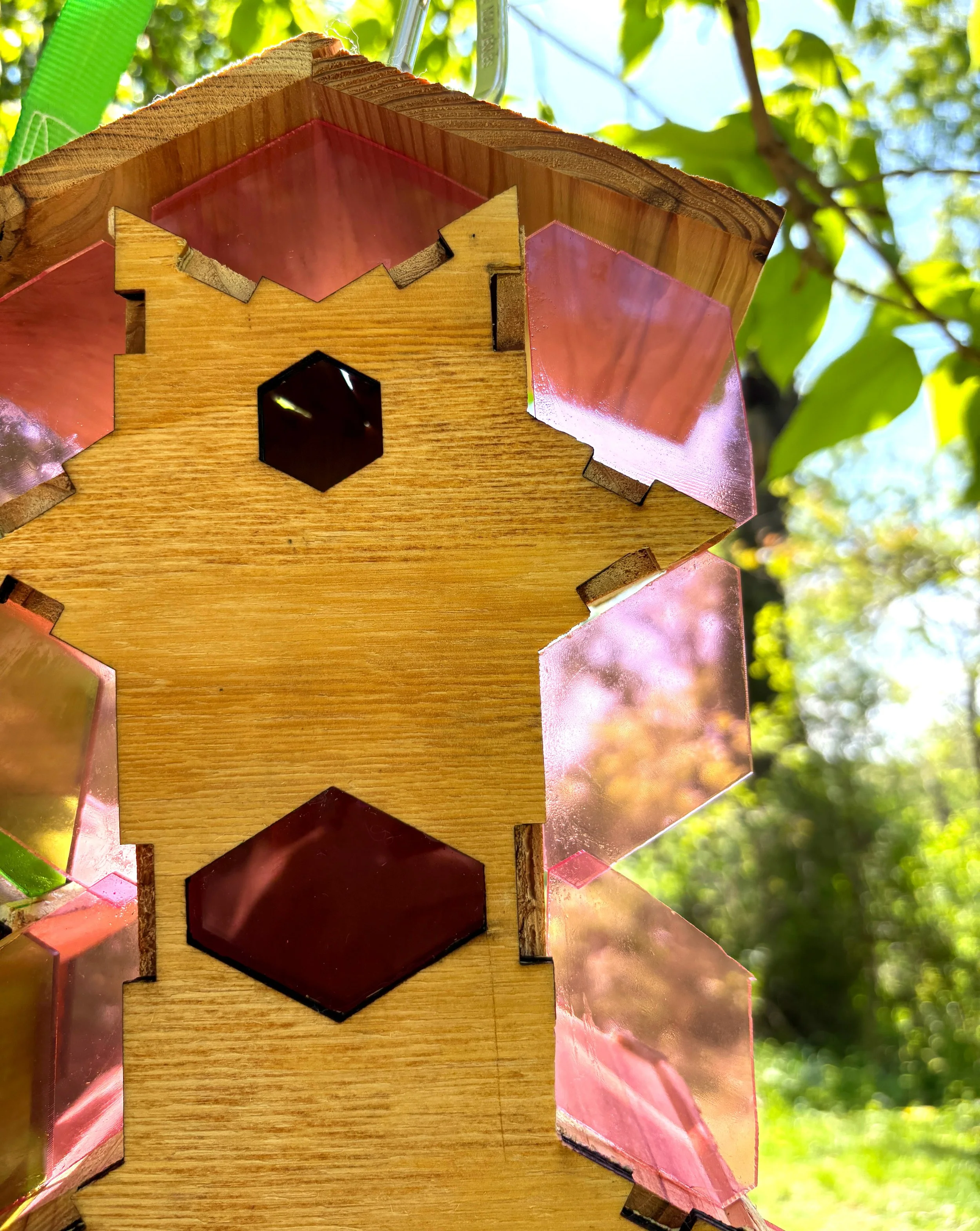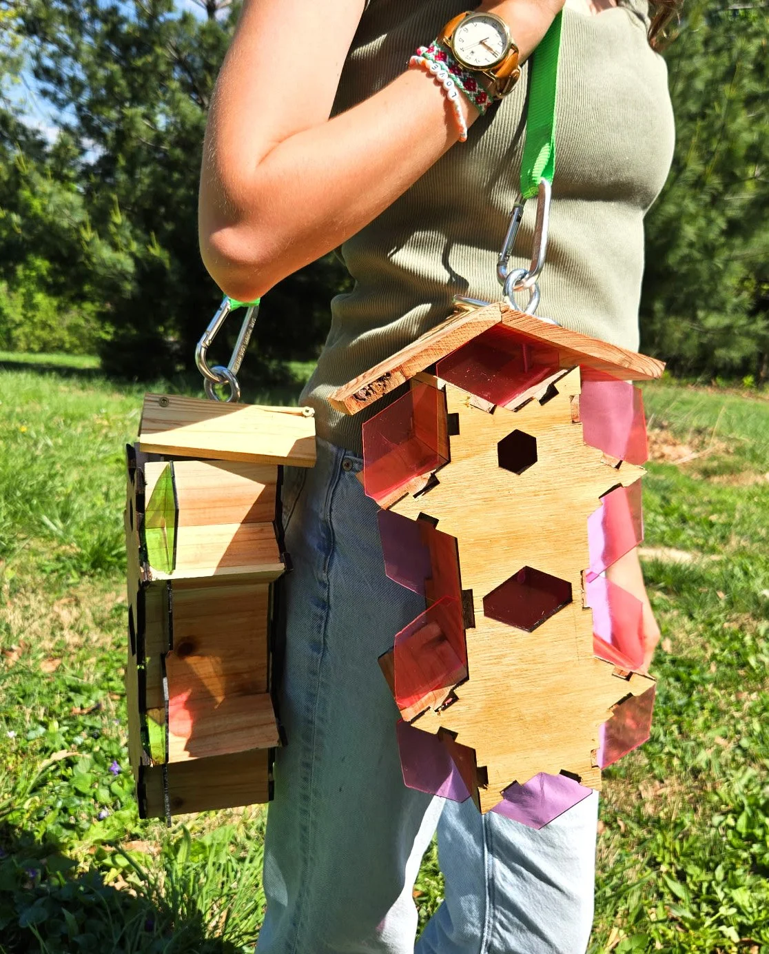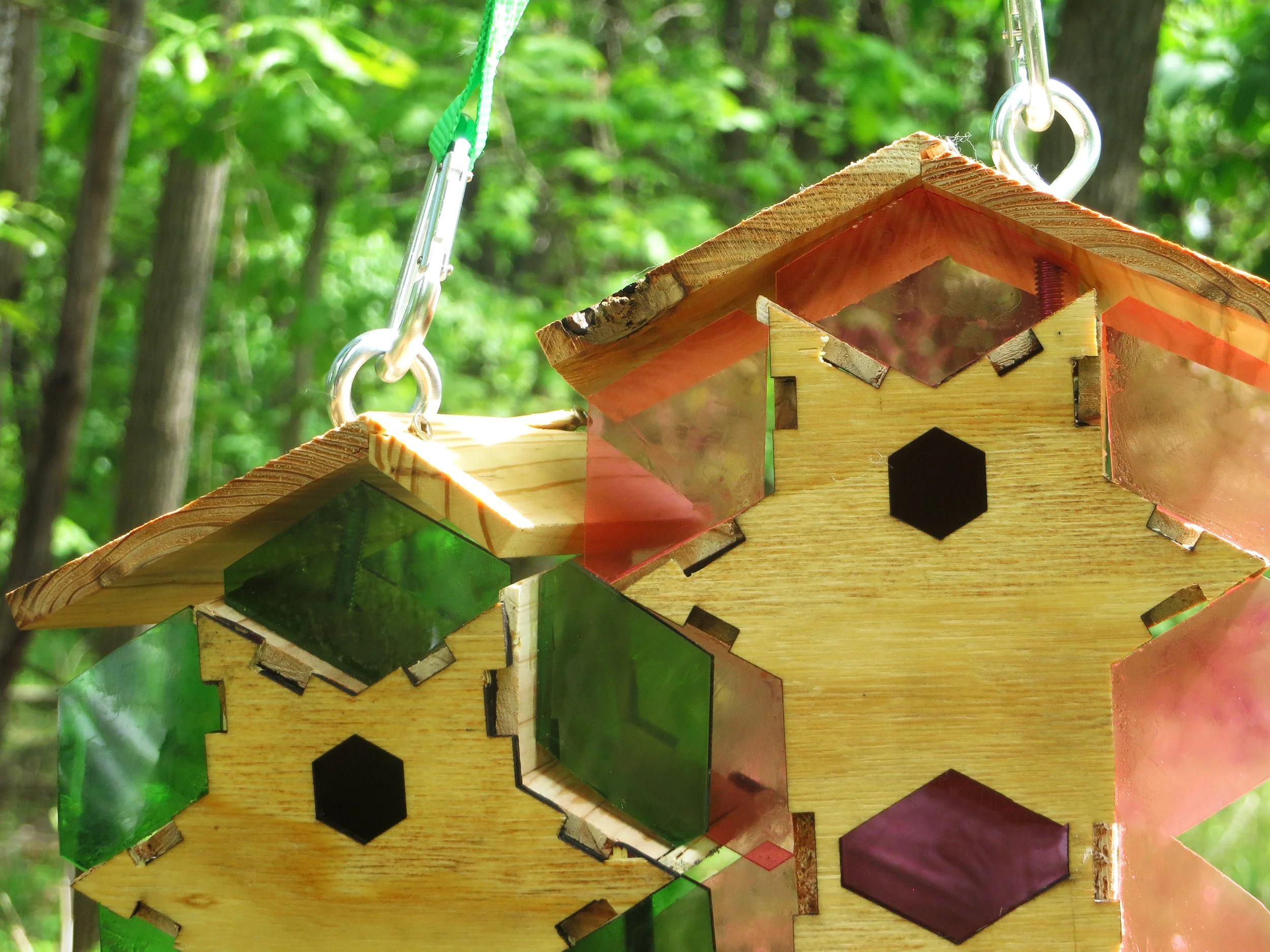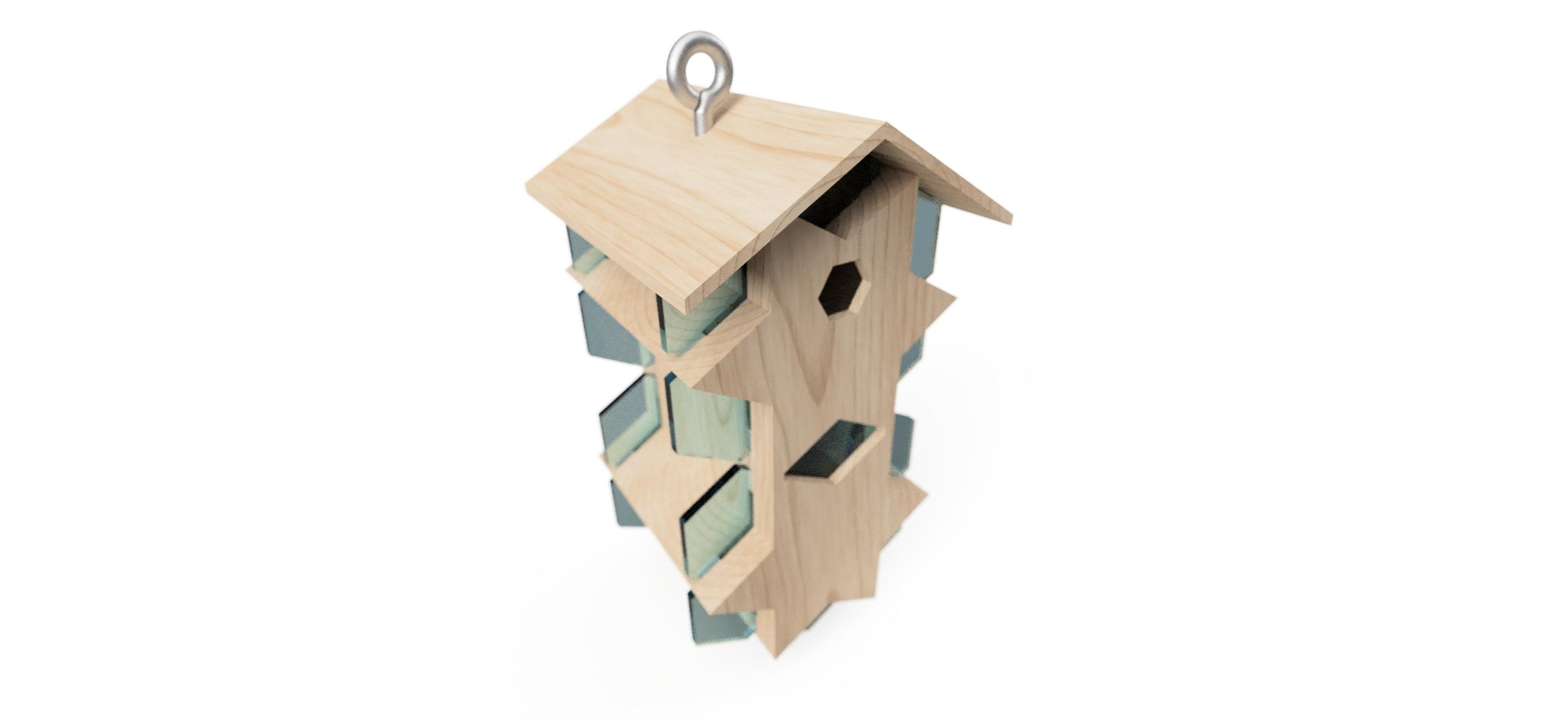 Demonstrates how the birdhouse is constructed and how the acrylic pieces hold together the modular units.