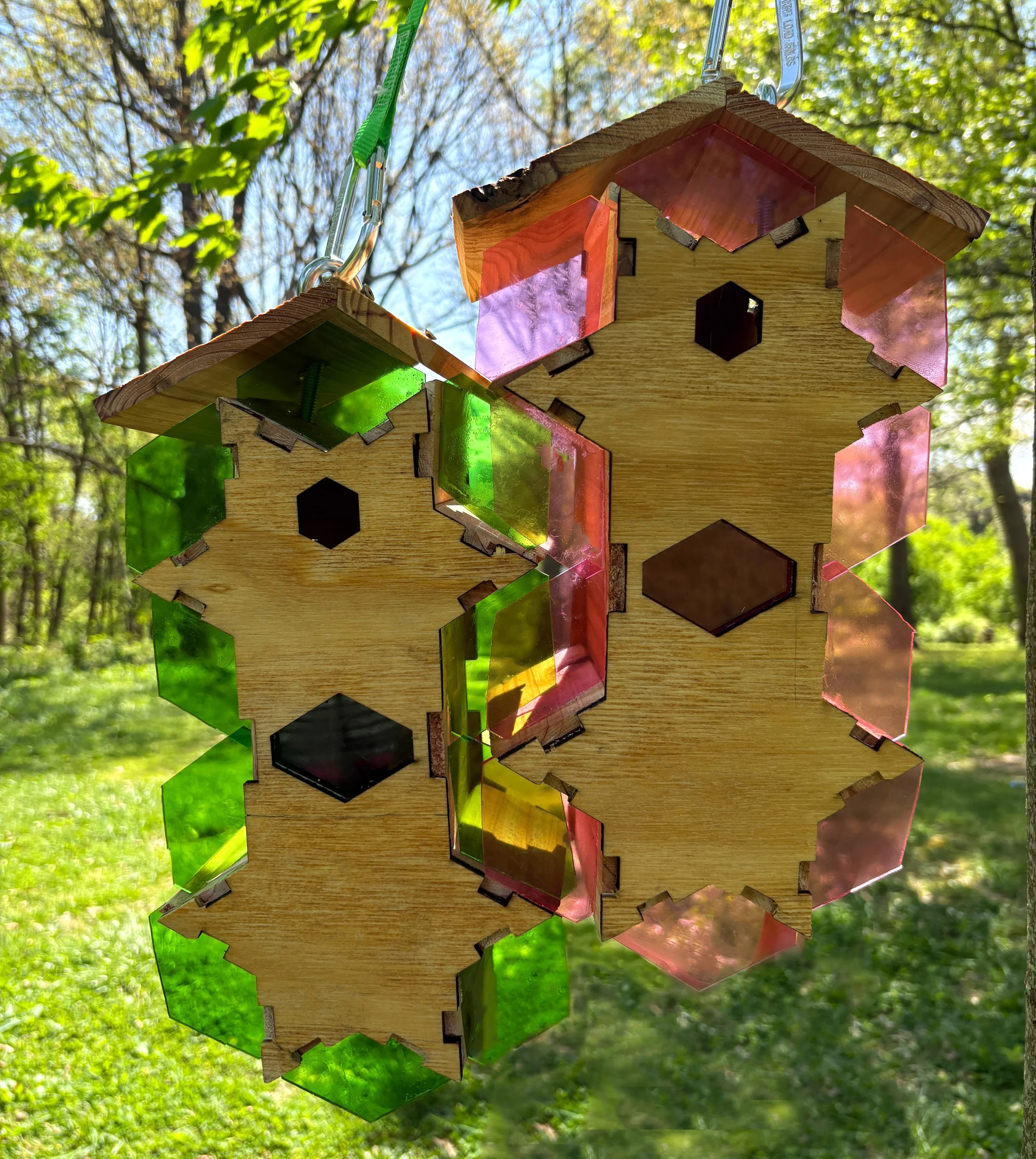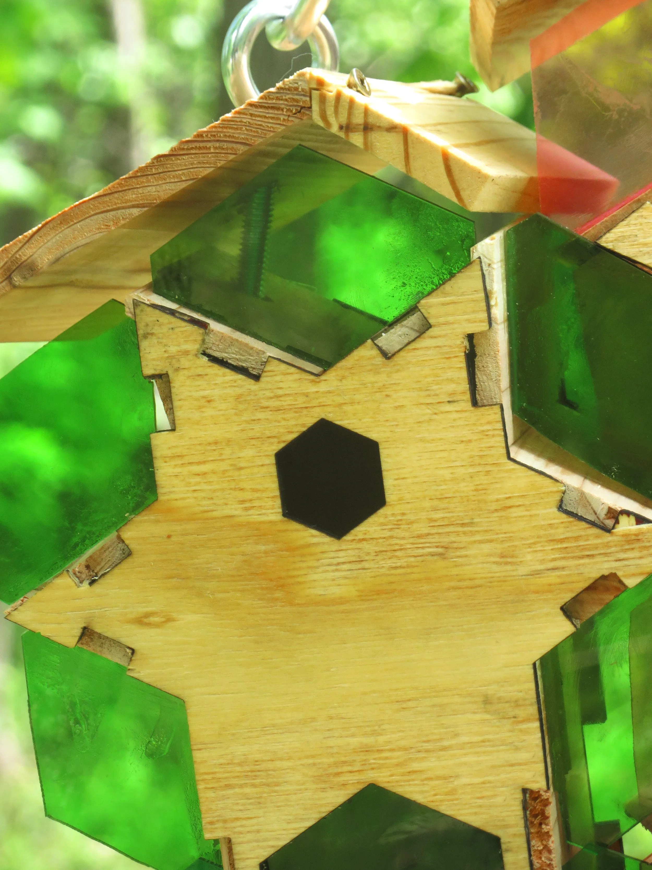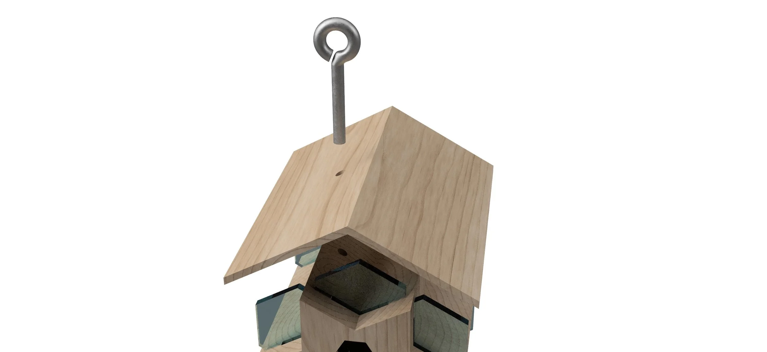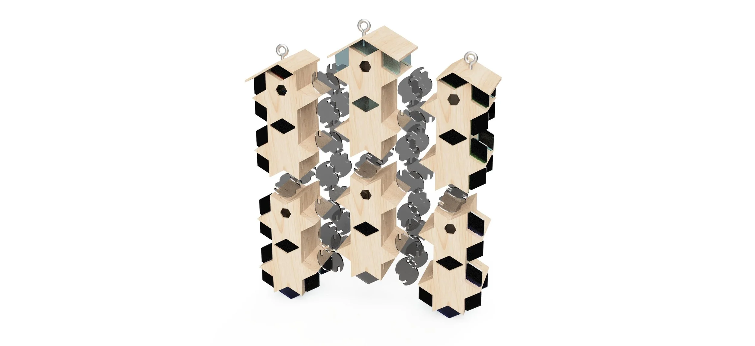 Demonstrates how the birdhouse is constructed and how the acrylic pieces hold together the modular units.