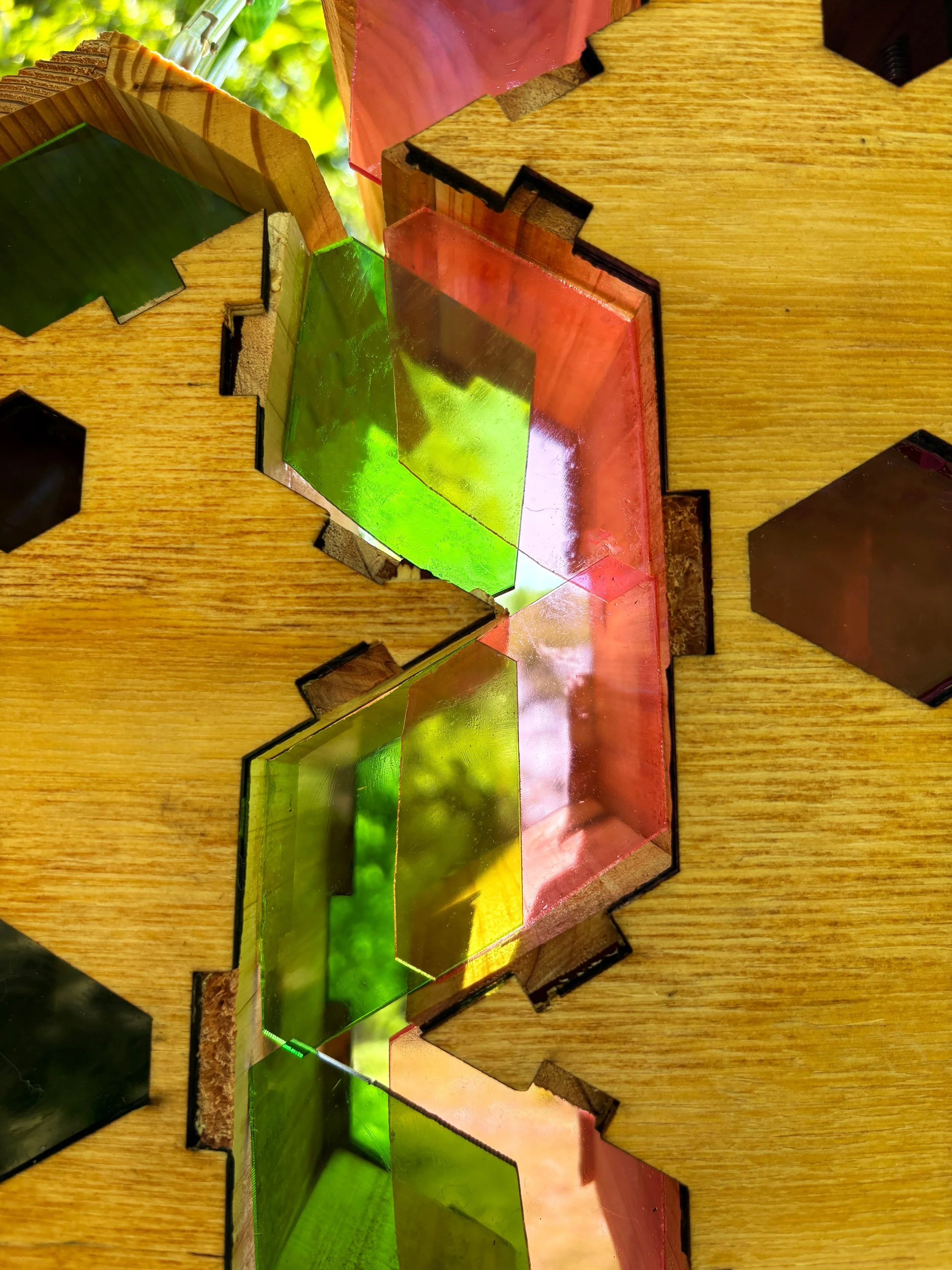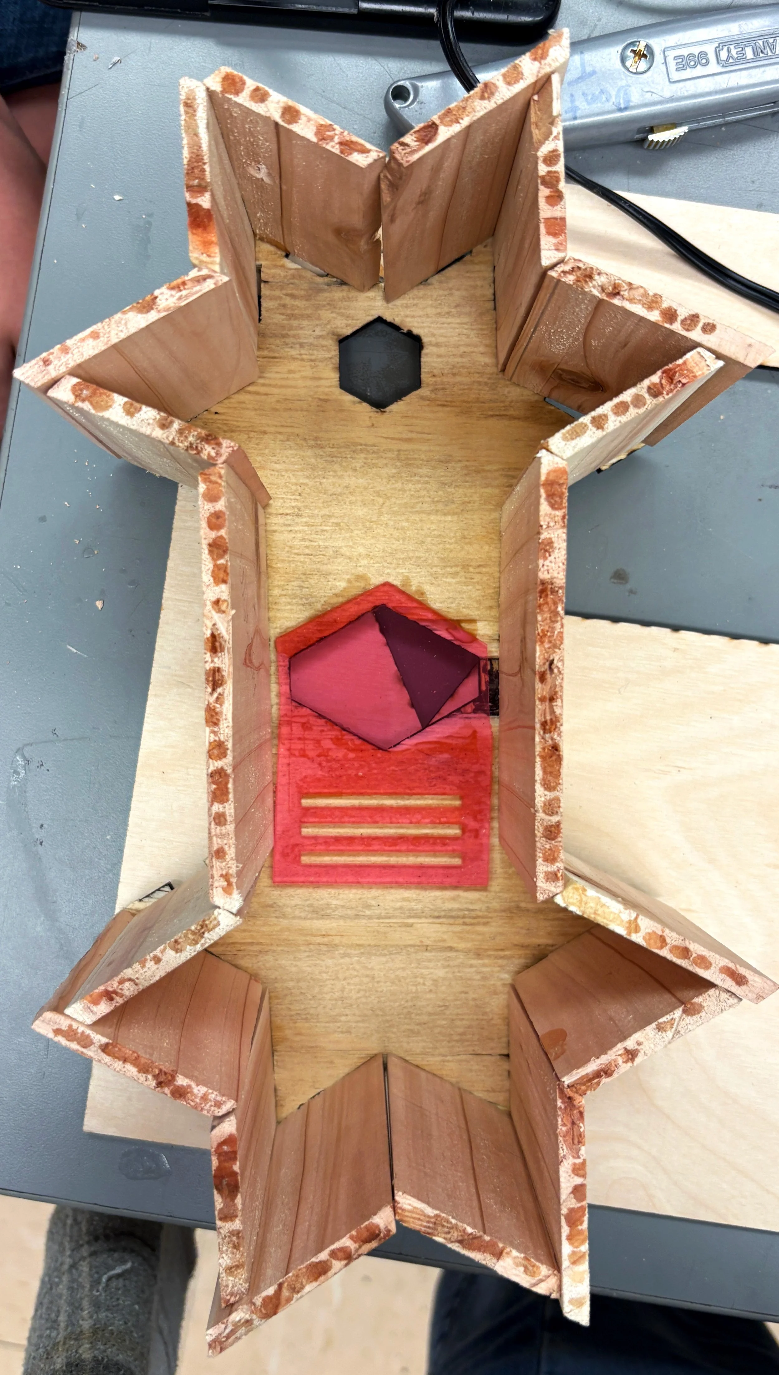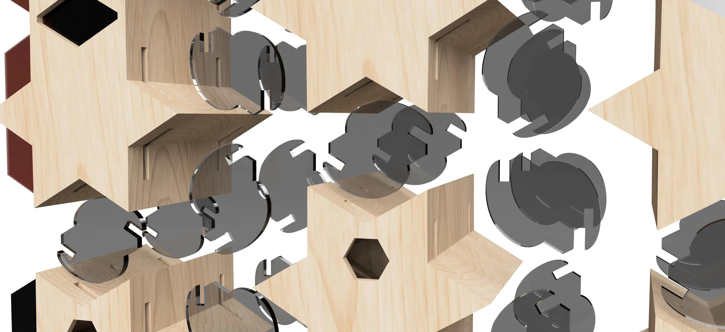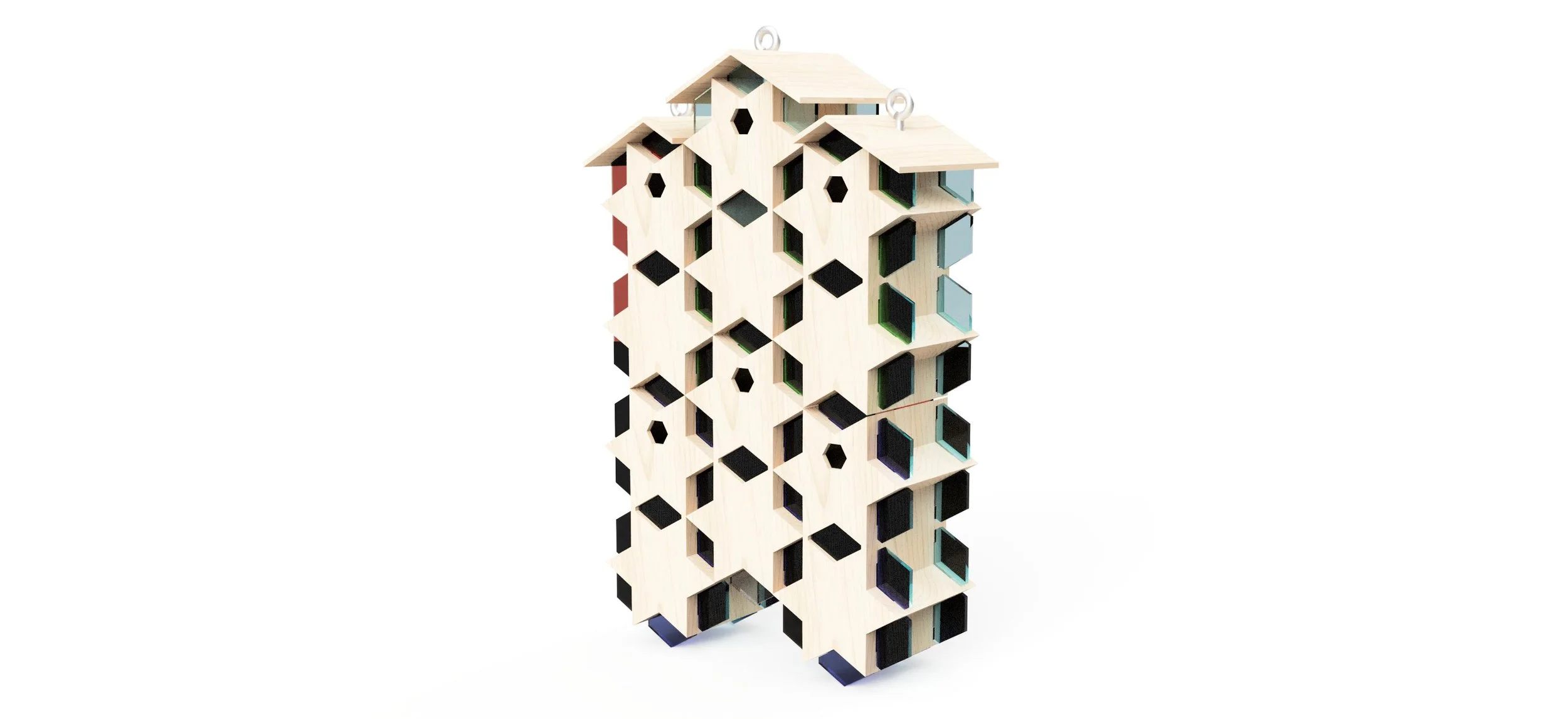 Demonstrates how the birdhouse is constructed and how the acrylic pieces hold together the modular units.