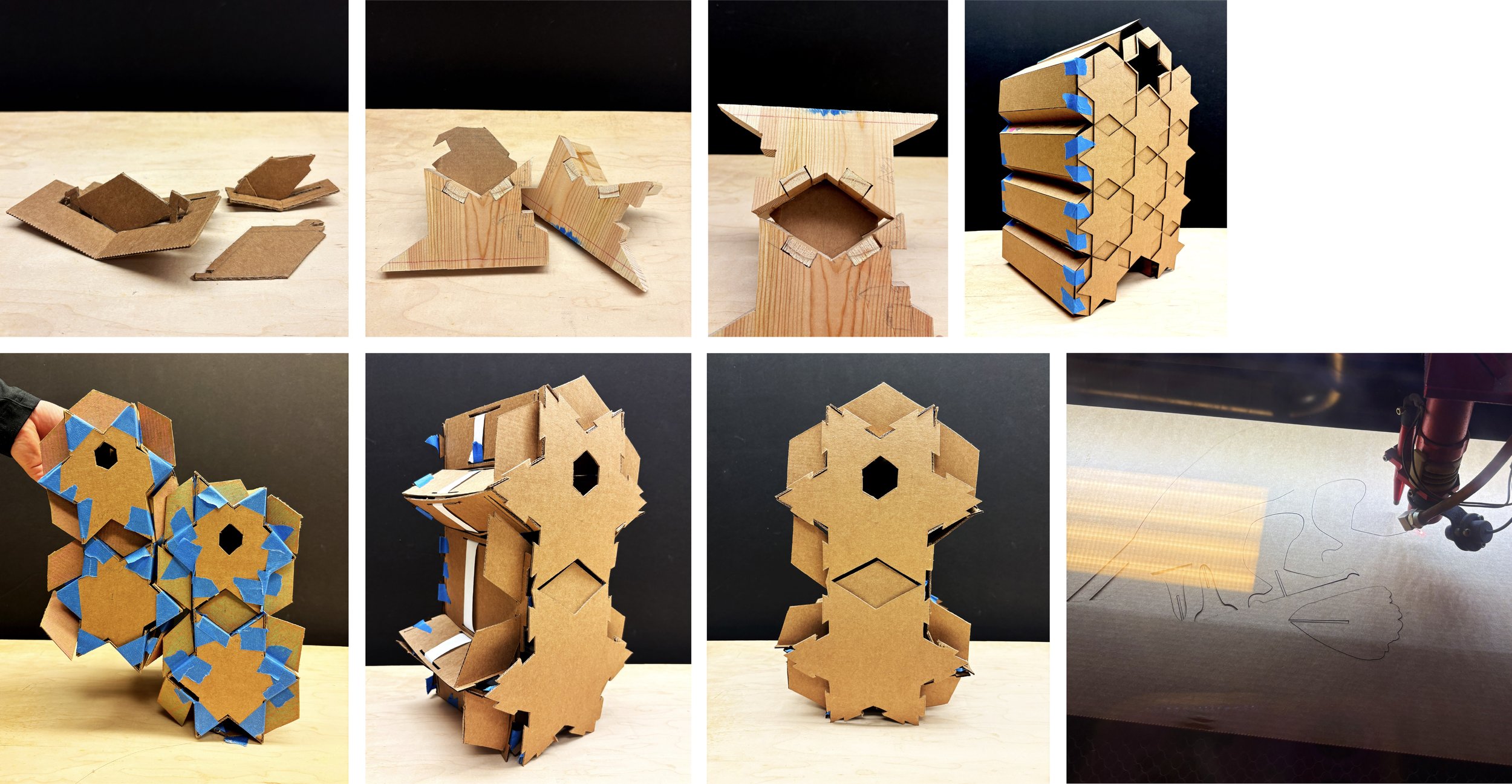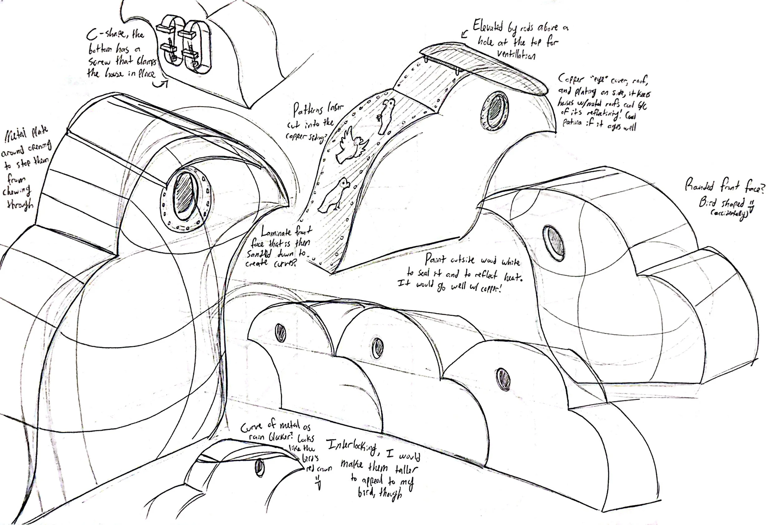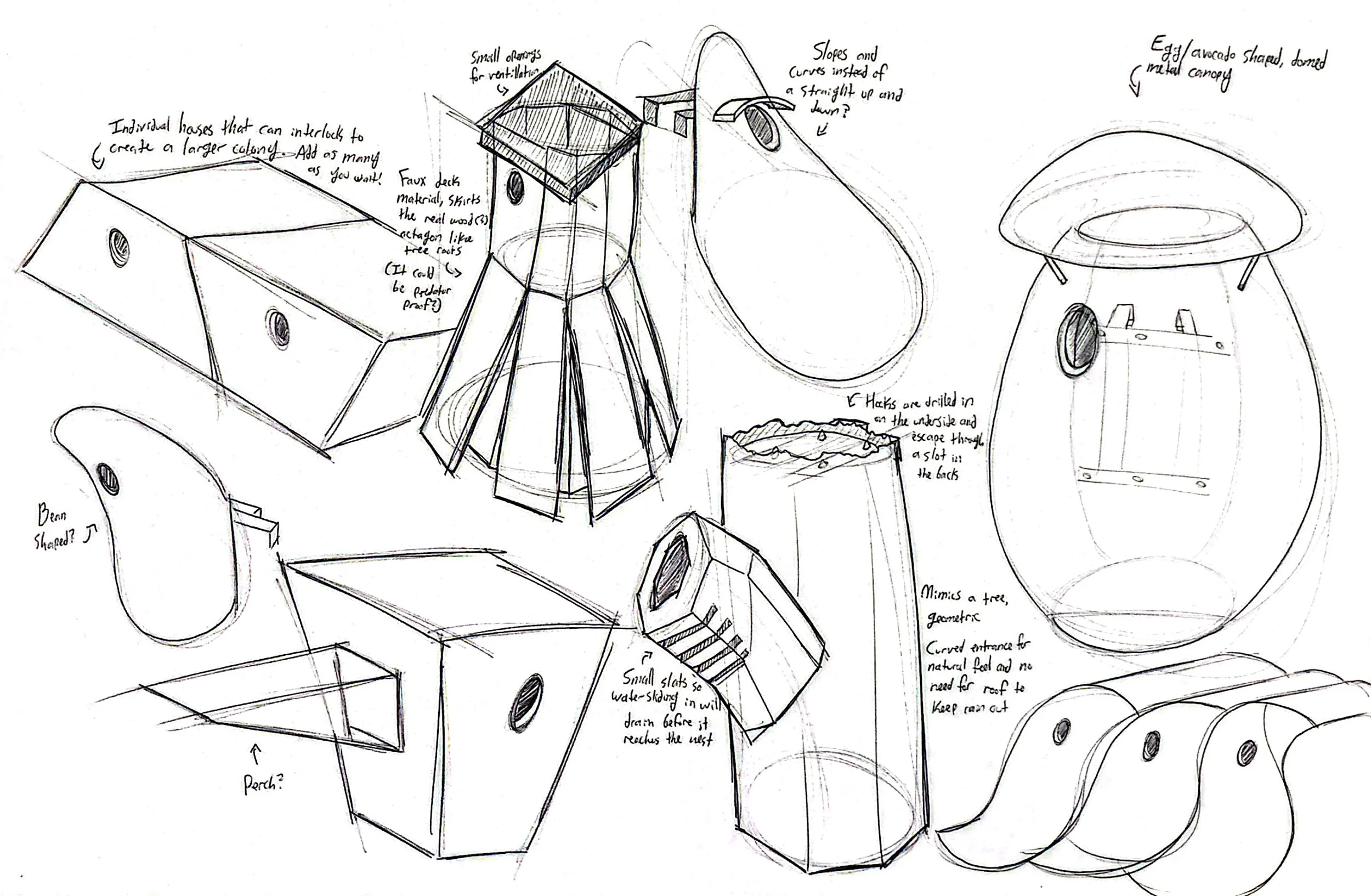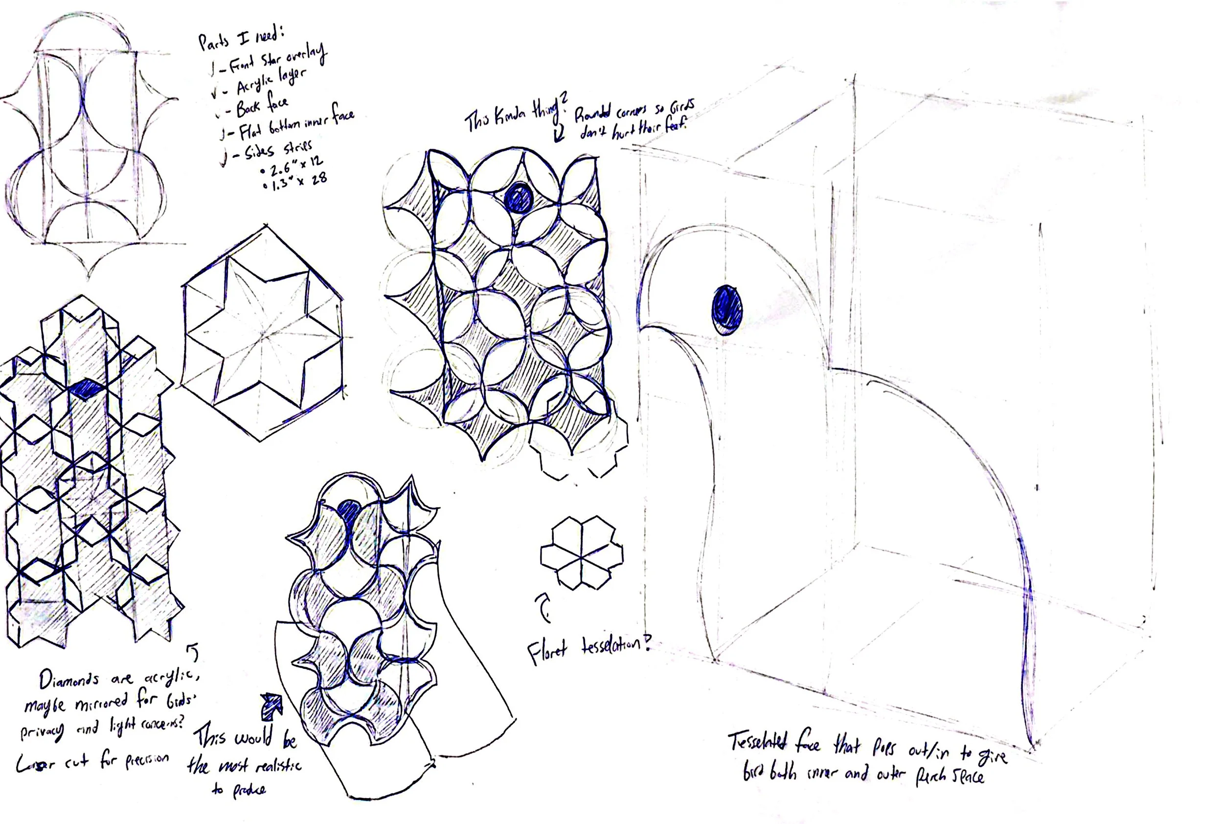 While the idea vastly changed over the course of the project, the core concepts stayed the same. I wanted to create a birdhouse that could be used modularly, allowing the consumer to choose how many birds they have space for. Eventually, I landed on the final hexagonal and star shaped tessellation. I vacillated between sketching and model making, which can be seen in my many phases of drawings and cardboard mock-ups.