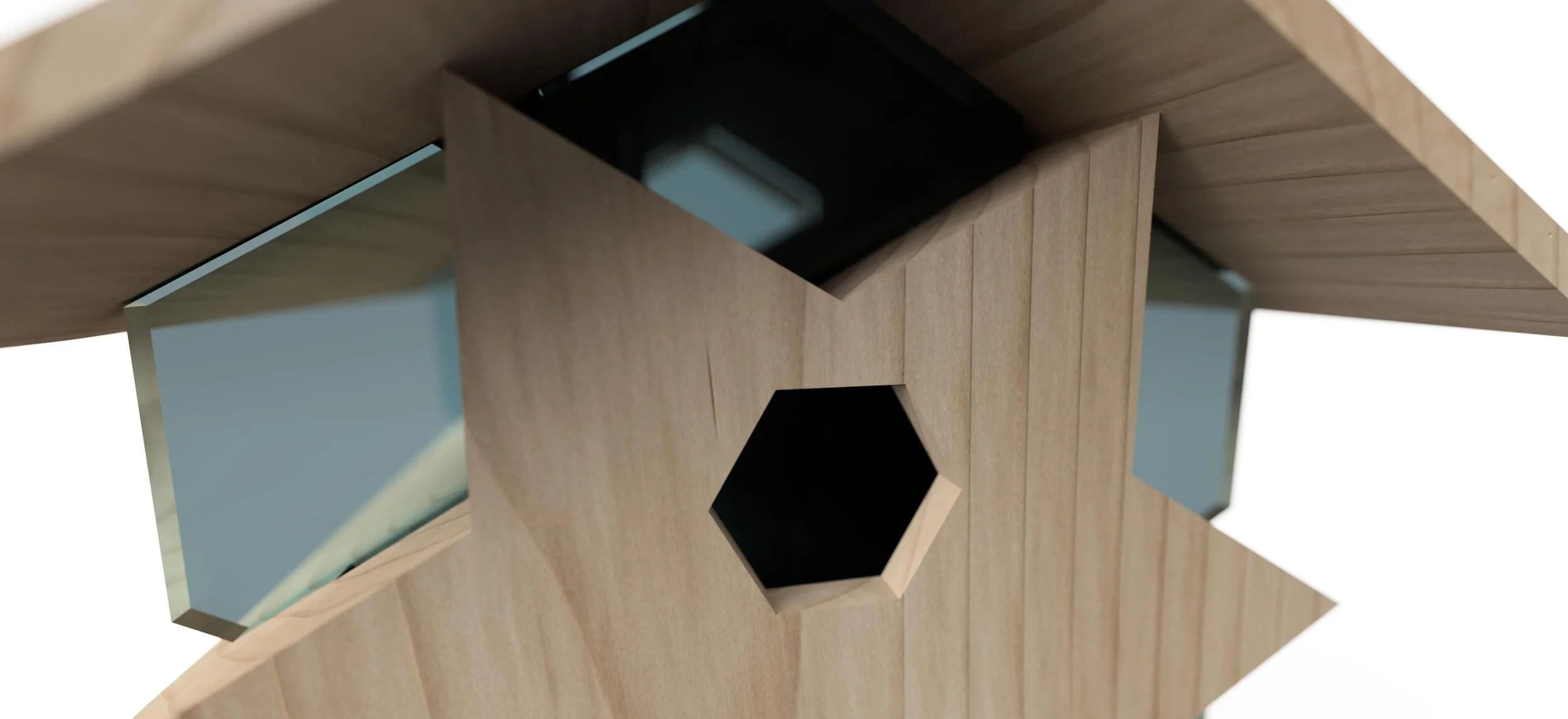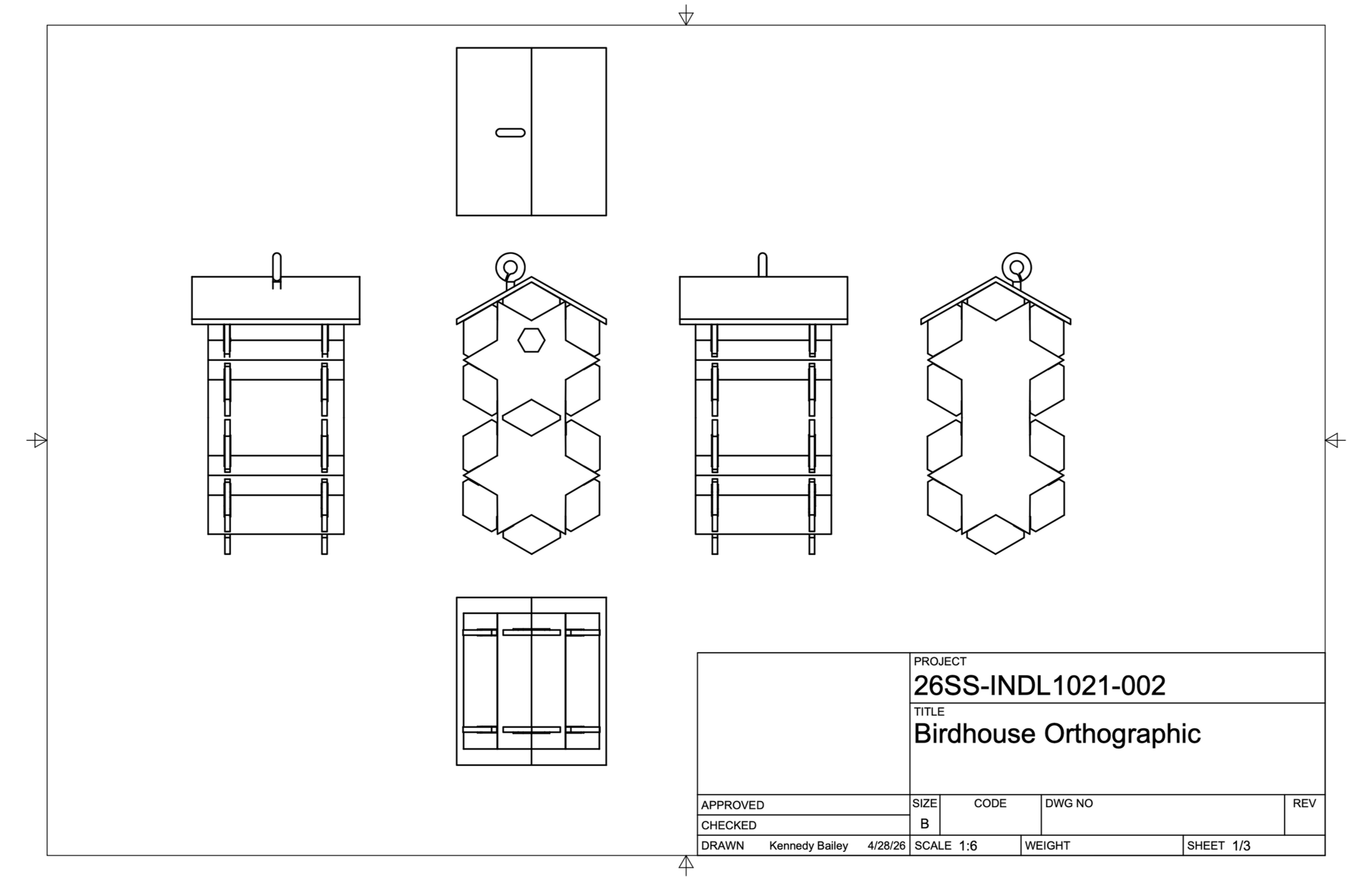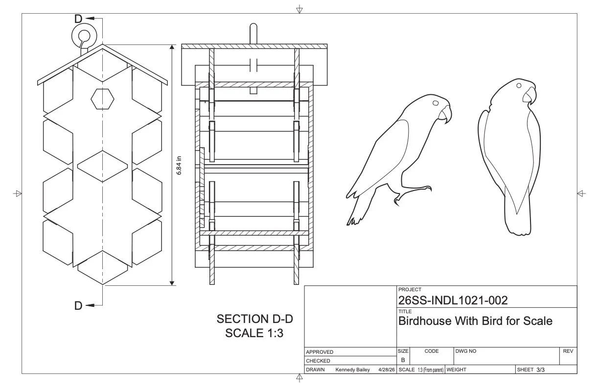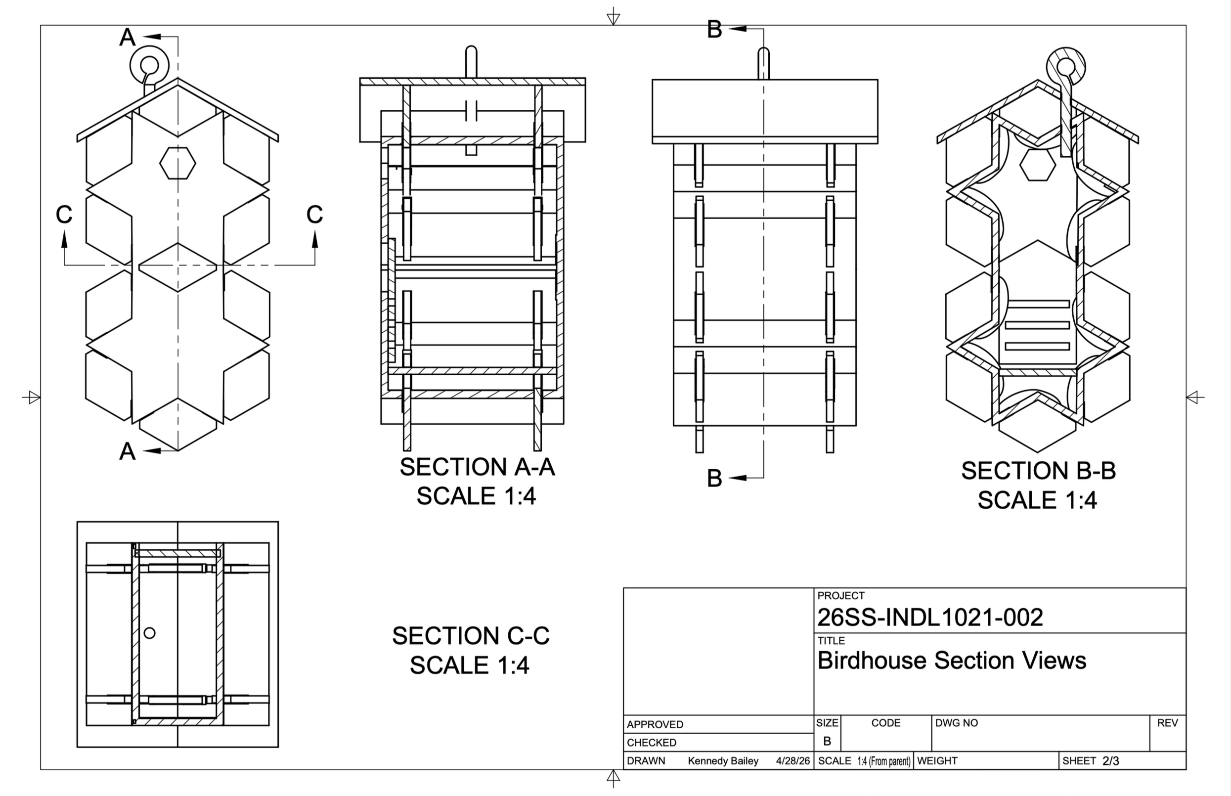 The final birdhouse design as a Fusion 360 model, in an orthographic view as well as section views to showcase the inside of the habitat.