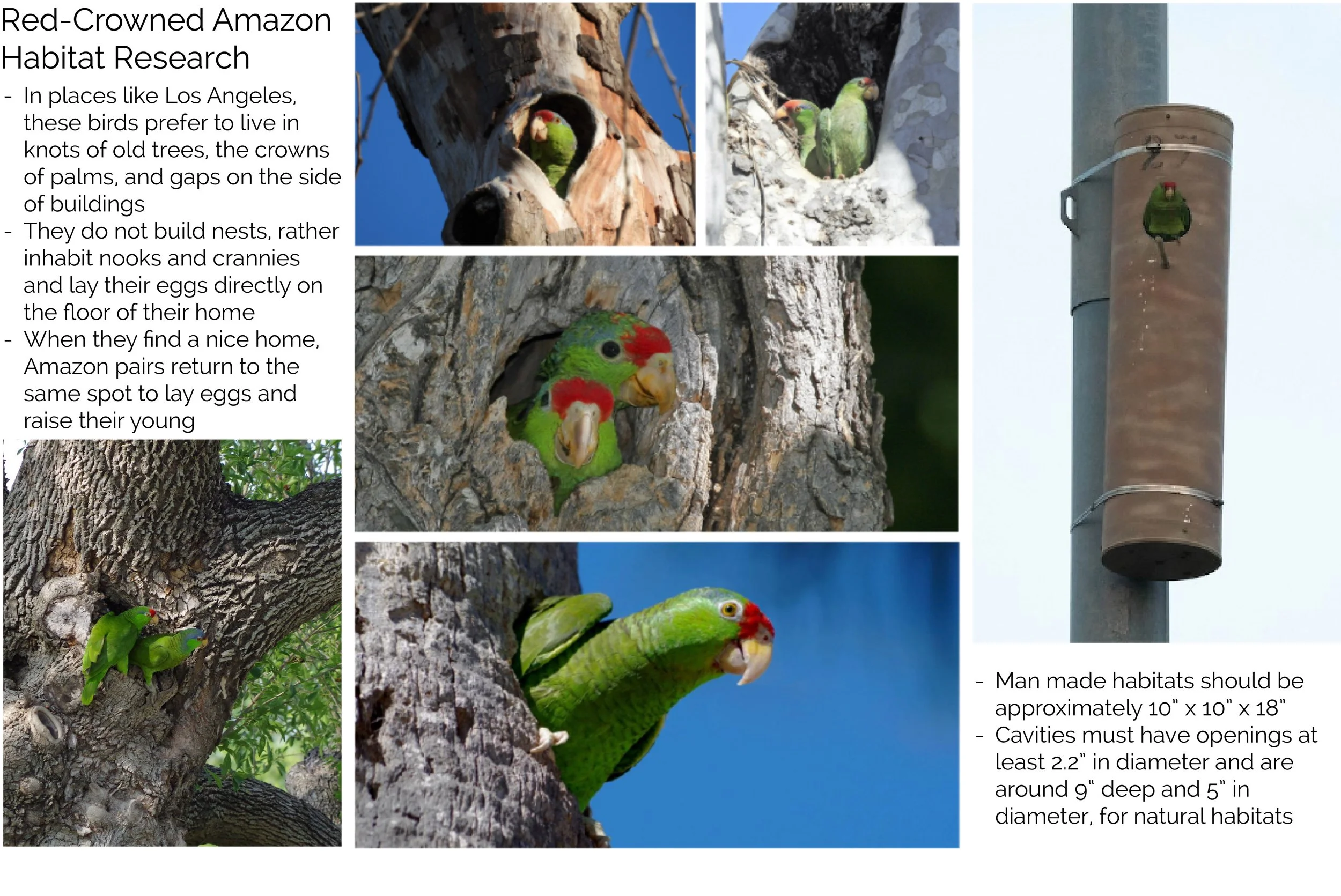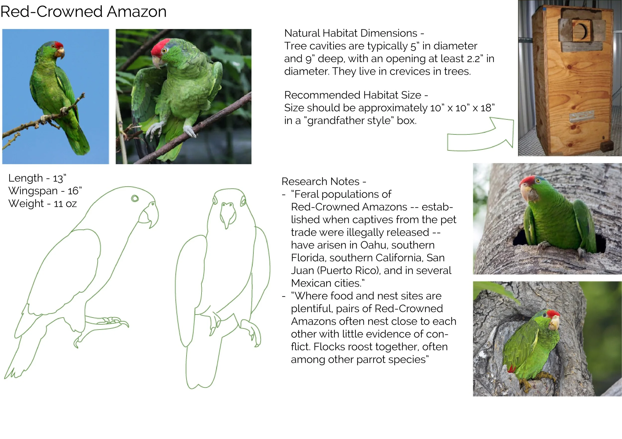 To design a birdhouse, one must understand both their avian inhabitant and the consumer who will be buying the product. My target audience is people who have a small yard or porch and would like to host Red-Crowned Amazons. The needs of the birds were harder to pinpoint, and are detailed in the pictured research boards.